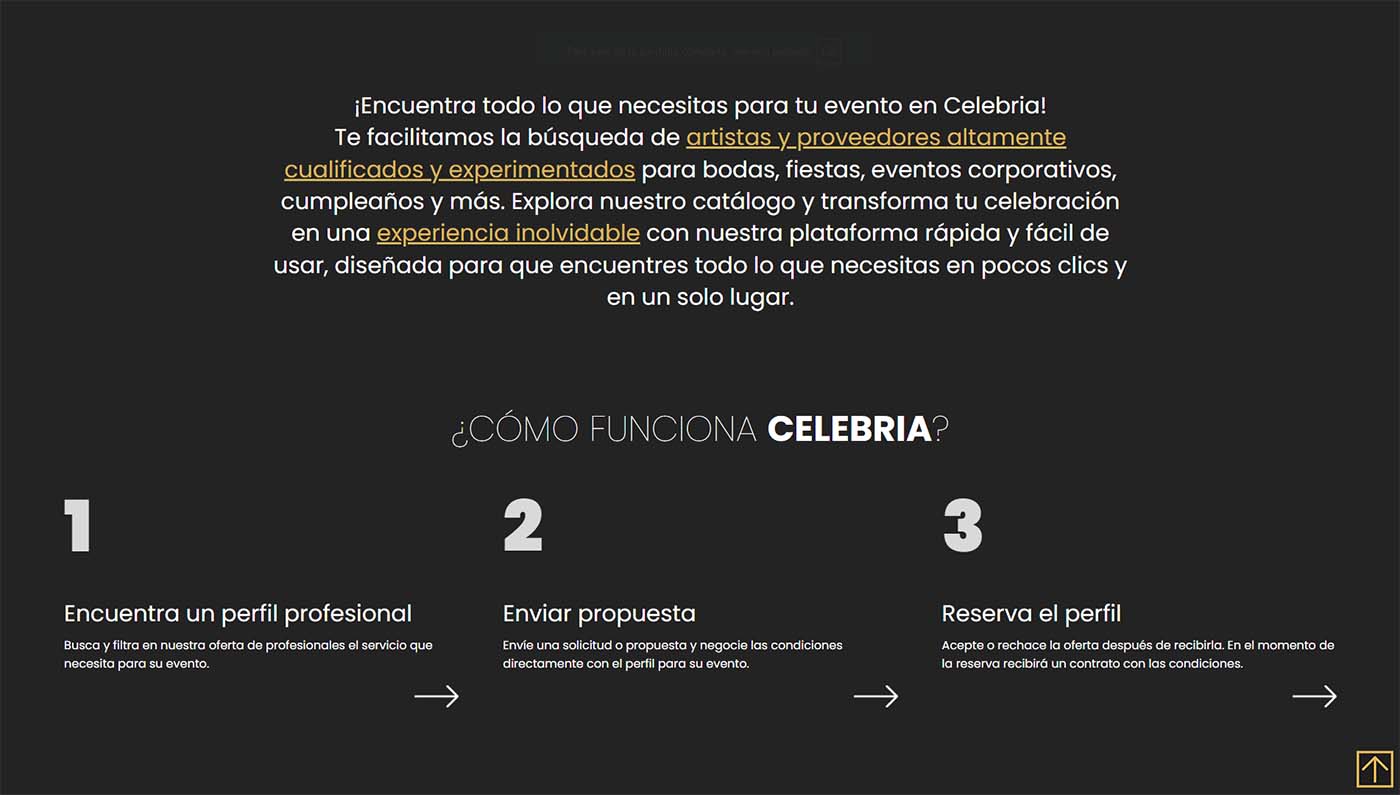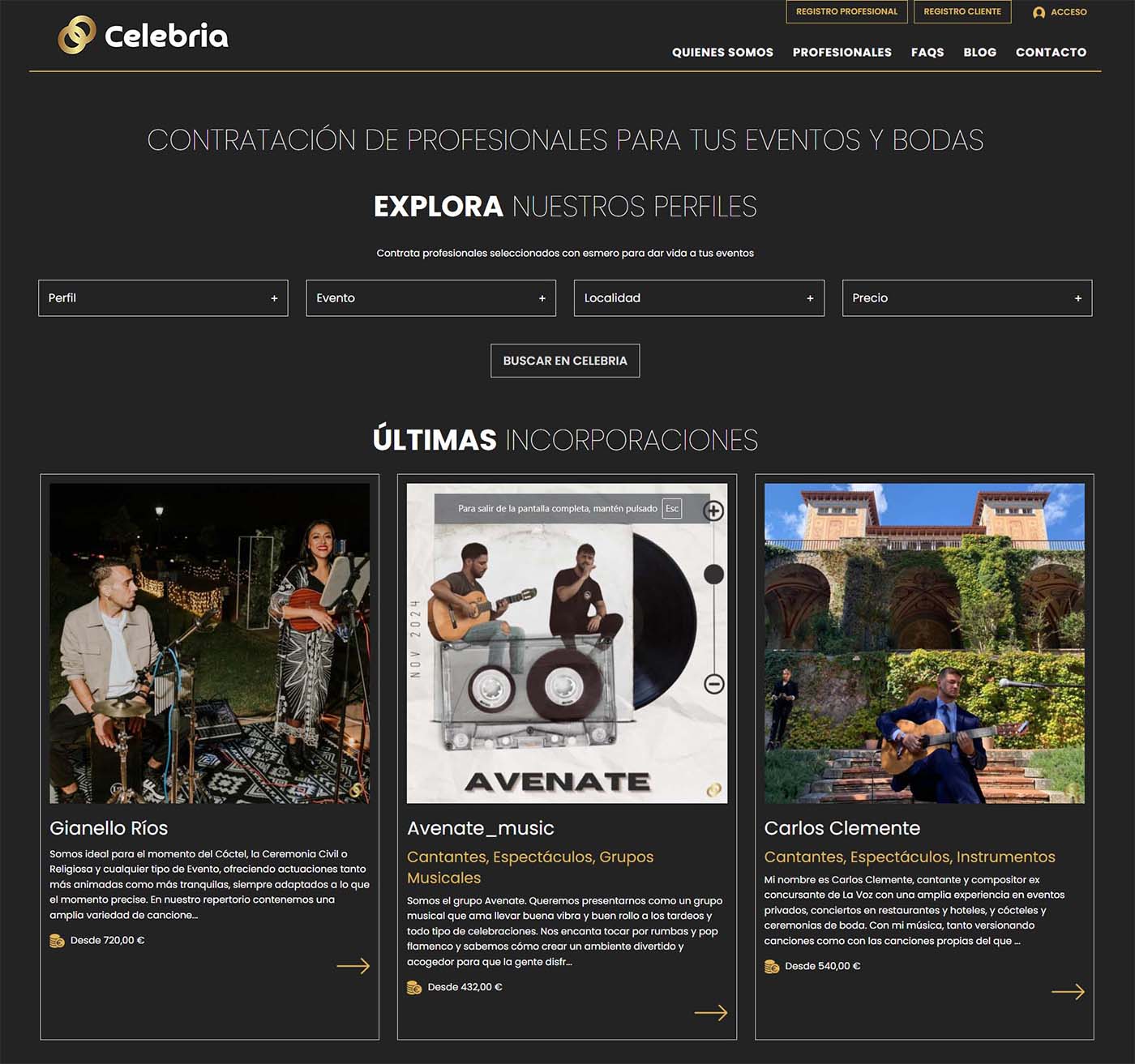 Eventos Celebria, es un portal web desarrollado para ofertar servicios de proveedores y profesionales para todo tipo de eventos y bodas. En Eventos Celebria podrás encontrar una ampla gama de artistas y profesionales, tales como DJs, grupos musicales, instrumentistas, bailarines, magos, conferenciantes, cómicos, txarangas, fotógrafos, wedding planners…